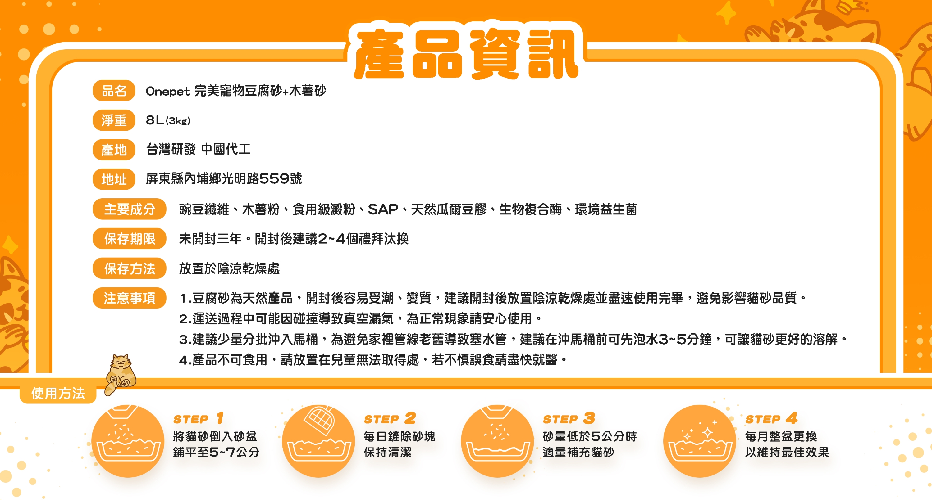 *一包3公斤 *一箱6包 1.添加環境益生菌 2.添加生物複合酶 3.添加SAP高分子吸水因子 木薯特性: 吸水性佳、結團性強、天然環保 超強比例: 70%豆腐砂、28%木薯砂、2% SAP
